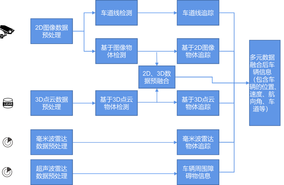 感知融合模塊是利用激光雷達、攝像頭、毫米波雷達、超聲波雷達等傳感器采集的路況信息,對采集到的信息進行基于人工智能技術的多源數據融合,實現對交通目標/事件檢測識別,進而實現對路況全要素全時空的全量感知。