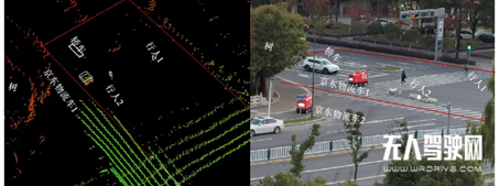 下圖顯示的是Explorer-E在全息路口部署的案例,在該路口中部署有激光雷達、攝像頭等傳感器,通過攝像頭2D數據和激光雷達3D點云數據的融合,實現了對該路口路況全要素全時空的感知。