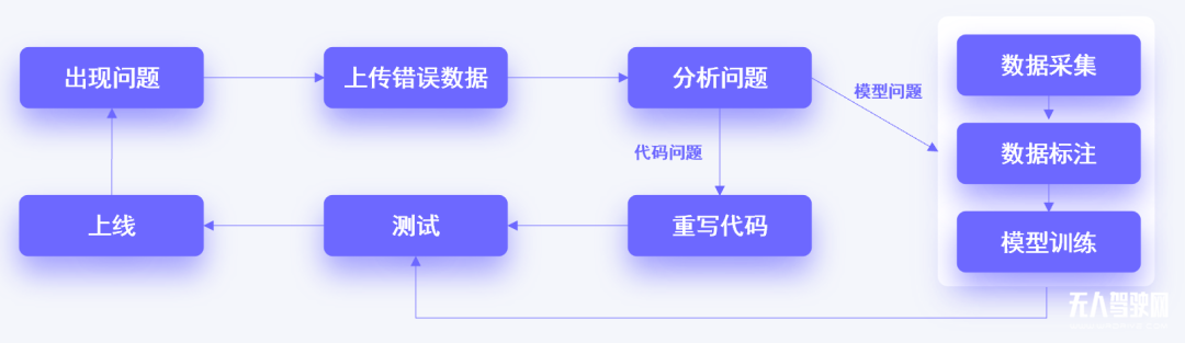 傳統軟件更多是在代碼端解決各類問題,但自動駕駛系統除代碼以外,還有更為關鍵的AI模型。代碼端的問題可以通過傳統的數據閉環方式予以解決,但模型端的調整則需要重新訓練或優化AI算法模型。