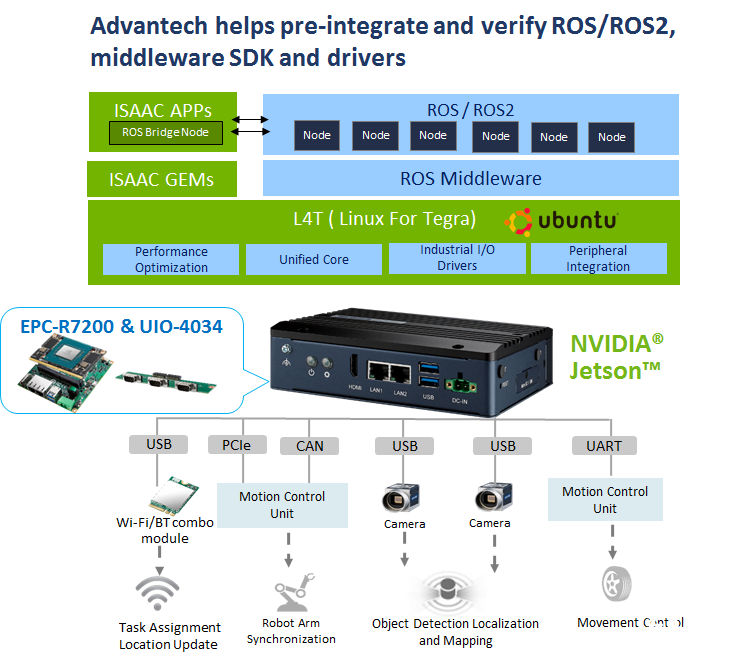 在此案例中,AMR上配置了EPC-R7200,而后用UART/RS-232介面操控移動輪,用2組USB口連接攝像頭以監測外部環境和物體移動,再用1組USB連接Wi-Fi/藍牙通訊,以便可以接收指派的搬運任務,另外用PCIe界面與CAN界面來操控搬運手臂。為了引取與實現CAN界面、UART/RS-232界面,也用上研華UIO40-Express I/O系列的UIO-4034擴展卡。