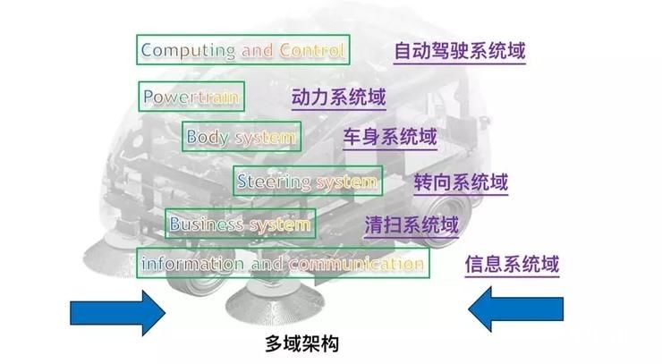 按照乘用車電子電器架構設計思路,將蝸小白分為以下域:自動駕駛域、動力系統域、車身系統域、轉向系統域、清掃系統域及信息系統域。其中:動力、車身、轉向及信息屬于支撐域,自動駕駛及清掃屬于功能域。