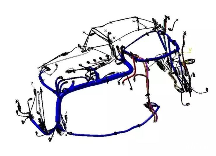 在蝸小白正向設計中,線束設計均采用乘用車級別設計流程,采用線束原理圖設計,整車線束3D圖紙設計,而后生產2D圖紙輸出加工。如下圖所示,藍色線束即為整車線束,全部采用采用車規級連接器,安全可靠,并進行干涉校核及工藝性校核來保障質量。所有線束全部由專業的車規級供應商進行生產,采用專業導通臺進行100%檢驗。