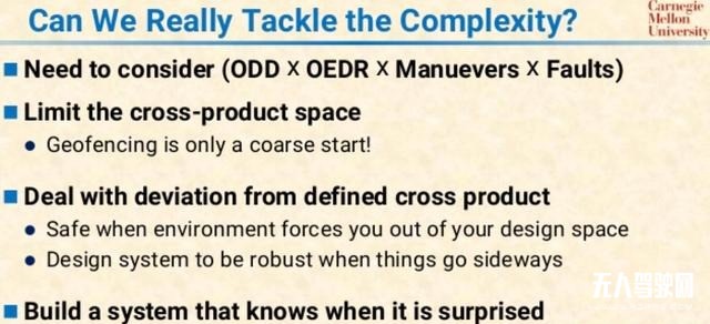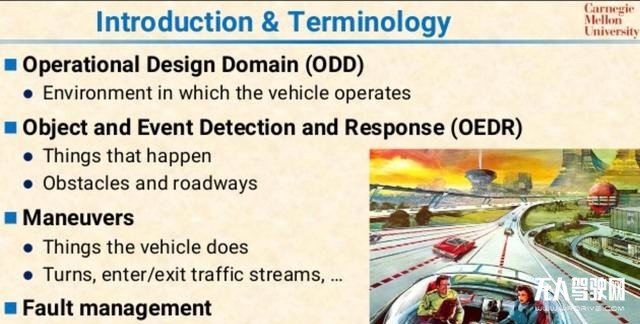 ODD:在實踐中,為了確??勺匪菪?,通常將操作環境限制到人類駕駛員可以處理的所有可能情況的一個子集。這種限制系統運行環境的方法也被稱為運行設計域(Operational Design Domain,ODD)。NHTSA(2017)將道路類型、地理特征、速度范圍、天氣等其他相關因素。在實踐中,會發現其他因素可能會非常廣泛。