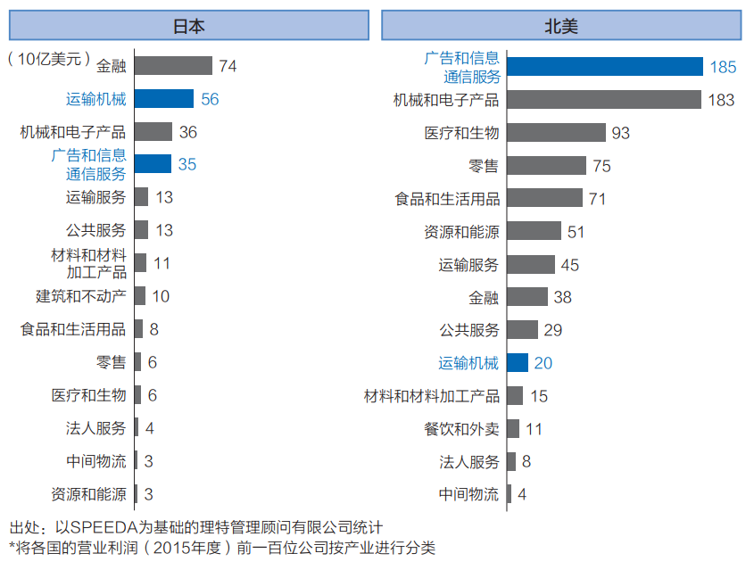 要特別確定對自動駕駛和移動出行服務產生影響的產業,首先就要了解各國產業結構的差異。在這里,我們將各國的主要產業,按照2015年度的利潤大小進行了排序,并從中發現幾個有趣的現象( 圖3-1)。