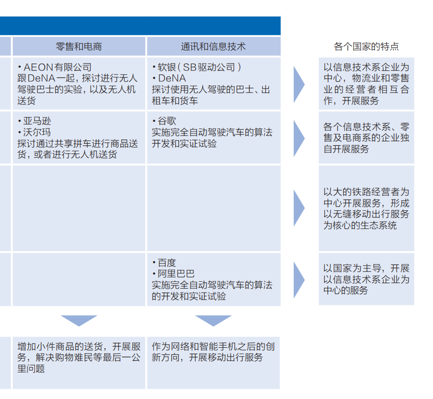 而且,在日本和歐洲,與信息技術系經營者相比,通訊系經營者的規模較大,像美國和中國那樣單一的信息技術系新興企業的存在感相對較低。實際上在日本,積極推動移動出行服務開發的是公司內部的創新部門( SB驅動公司),還有推動無人巴士服務,并在無人巴士上使用自動駕駛技術的軟銀集團,以及NTT 都客夢等移動通信的經營者。