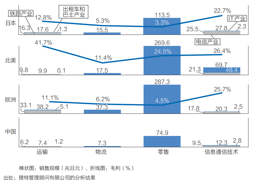 零售產業的規模則幾乎和地區的經濟規模呈正比,與其他產業相比,零售產業的銷售規模要大十倍。零售業的業務形態今后將如何發展,可能會對各國移動出行服務的改革產生較大的影響。另外,相對而言,美國的零售業經營者利潤較高,在開發新型服務的剩余資本的投資能力上,美國企業處于優勢。