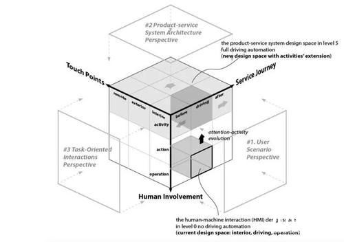 在產品邏輯上,我們必須考慮自動駕駛產品服務系統的三個基本維度,包括基于上文所述的駕駛員/用戶注意力-活動變化下系統中的人的參與程度、體現具體業務流程的服務旅程以及接觸點,包括如何使用核心產品(車輛)和其他相關產品和系統。通過整合這三個維度(人的參與、服務旅程和接觸點)去思考將為我們揭示一些新的設計機會。