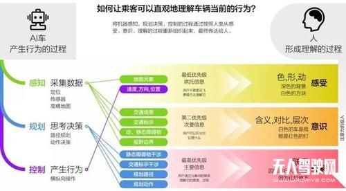 人類是按照感受,意識,理解這樣的過程建立對事物的認識的。而AI產生行為的過程也有相似的運行邏輯,它們需要先從傳感器和高精地圖拿到原始數據,通過算法提取現實世界中的各種對象;然后通過決策和規劃過程,去思考當前場景下的下一步的處理方式;最后通過車輛的橫縱向控制完成預期的動作和規劃。這個過程中,用戶可以通過對色彩,形狀,運動等信息,很本能地去感受地圖中的元素,車速,方向等信息;再進一步,用戶形成了意識,他們通過畫面中的對比、層次區分出了場景中的障礙物、交通標識、視野邊界等含義。最后,通過建立元素之間的聯系,用戶通過建立元素間的聯系去理解它們的原理及過程,比如車因為躲避行人而停下。這也是我們為什么淡化交通場景,打平所有感知內容,而去突出AV本身及其規劃路徑和干涉內容的原因。