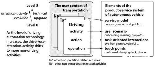 未來將以基于旅程相關的產品服務系統設計復雜的可持續性的汽車行業設計生態,我們采用產品服務系統(PSS)設計思路,推演出一種基于用戶注意力-活動維度伴隨自動駕駛技術升級而產生的變遷及其對應的設計考量因素。