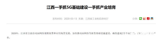 2020年,江西省全面啟動5G網絡規模部署和應用場景發展,加快推動5G網絡等新型基礎設施建設,確保建成2萬個5G基站,同時大力培育5G產業。