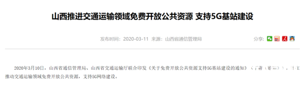 山西省通信管理局、山西省交通運輸廳聯合印發《關于免費開放公共資源支持5G基站建設的通知》?!锻ㄖ分赋?,5G建設對高速公路、智能網聯汽車等5G+智能交通有重要示范應用,還可以全面提升全網分段自由流計費收費系統。各級交通運輸主管部門及各相關企業要全力支持5G基站建設,力爭在三年內實現主要高速公路、重要國省道5G網絡連續覆蓋。