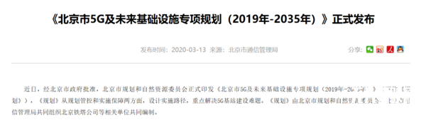 《北京市5G及未來基礎設施專項規劃(2019年-2035年)》正式發布,《規劃》明確了基站規劃設置標準、基站選址與建設原則,細化了中心城區、城市副中心、亦莊經濟技術開發區、未來科學城、懷柔科學城等重點區域基站布局規劃。