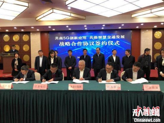 當日,江蘇“共商5G創新應用 共推智慧交通發展”戰略合作協議簽約儀式在南京舉行。江蘇省交通運輸廳與電信、移動、聯通、鐵塔公司簽署5G戰略合作協議。江蘇交通控股、省港口集團、省鐵路集團分別與電信、移動、聯通、鐵塔簽署5G業務合作協議。