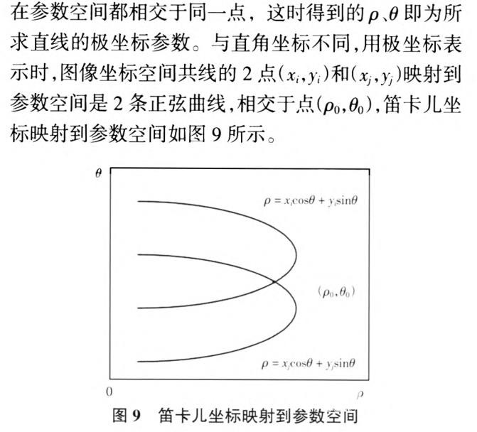 與直角坐標類似,極坐標中的霍夫變換也把圖像坐標空間中的點變換到參數空間中。用極坐標表示時,圖像坐標空間中共線的點映射到參數空間以后,在參數空間都相交于同一點,這時得到的P、θ即為所求直線的極坐標參數。
