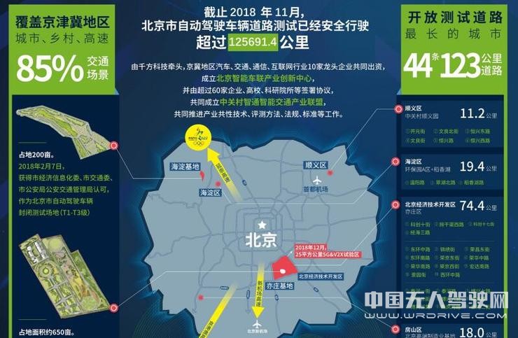 截至2018年11月,北京自動駕駛車輛道路測試已經安全行駛超過12.56萬公里,開放了44條共123公里測試道路,覆蓋京津冀地區城市、鄉村、高速等85%交通場景。其中位于北京亦莊的測試道路達到74.4公里,成為目前國內最長的自動駕駛測試道路。