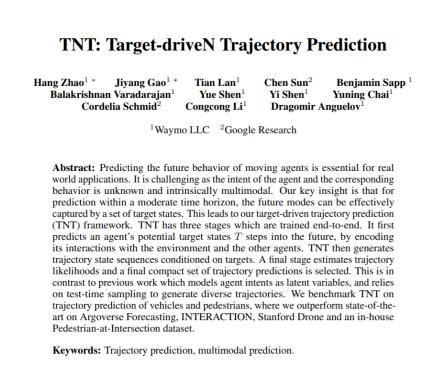 該團隊提出的 TNT 首次運用了監督學習的方法對車輛和行人進行多軌跡預測,是一種目的地引導的軌跡預測方法。其模型的最大貢獻,就是能夠不依靠采樣,純靠監督學習來進行多軌跡的行為預測。
