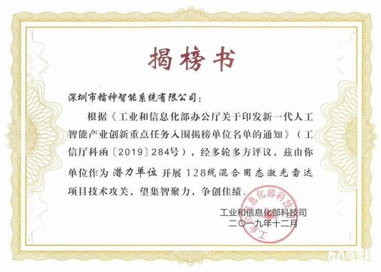 鐳神智能以 “128線混合固態激光雷達”項目入選“新一代人工智能產業創新重點任務入圍揭榜單位名單”,并集結了研發精銳力量對128線混合固態激光雷達的多方面性能進行技術攻關和持續優化。本次工信部對揭榜單位評優,鐳神智能為廣東省唯一入選的激光雷達公司,充分表明了對鐳神智能領先的激光感知技術與成果的認可。