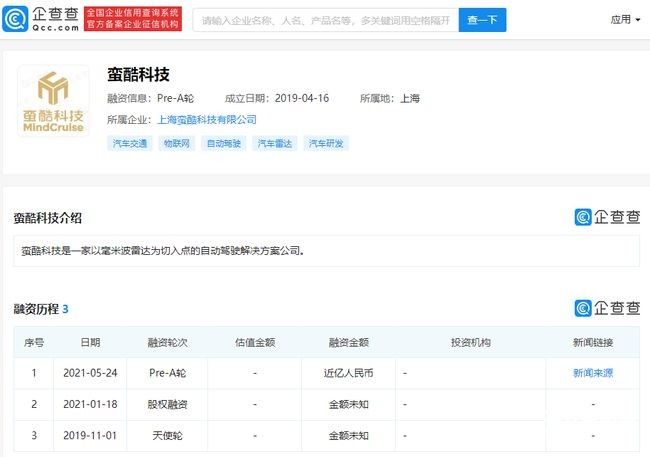 企查查顯示,蠻酷科技創立于2019年,是一家專注于汽車自動駕駛解決方案的高科技企業,且早在企業創立之初,其便已獲得將門創投天使輪2000萬元人民幣投資,至今已完成3輪融資。