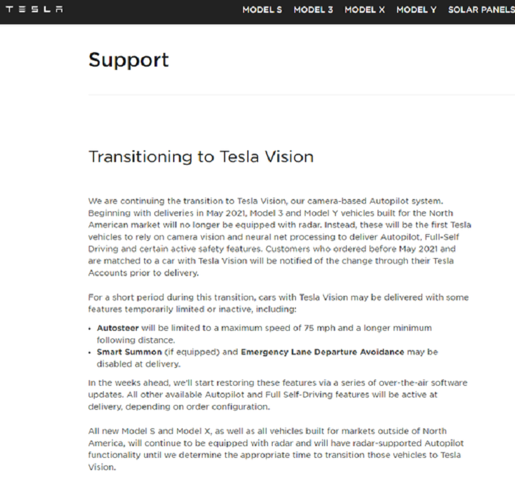 特斯拉在一份聲明中表示,這將是第一批依靠相機視覺和神經網絡處理來提供自動輔助駕駛、完全自動駕駛和某些主動安全功能的特斯拉汽車。但所有新的Model S和Model X汽車,以及為北美以外市場制造的所有車輛仍將配備雷達。