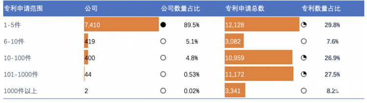 從申請人總量上看,截至目前我國已經有超過8200家公司參與了專利申請,并且每年仍有源源不斷的新加入者。但是,大部分公司技術儲備薄弱,超過62%的專利申請來自在5.4%的公司;有近90%的公司,專利申請數量不超過5件,其中僅申請了1件自動駕駛相關專利的公司就超過4600家。