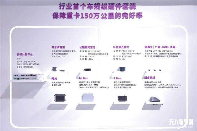 在這次大會上嬴徹也首次展示了全套車規級硬件套裝,包括長距和補盲激光雷達、毫米波雷達、攝像頭、GPS/IMU、計算平臺、網關、T-Box、IVI-Box等,所有零部件均經過包括工程、開發、生產三階段的嚴格認證,和電氣、機械、環境和電磁的試驗驗證,滿足重卡150萬公里生命周期的可靠性耐久性。