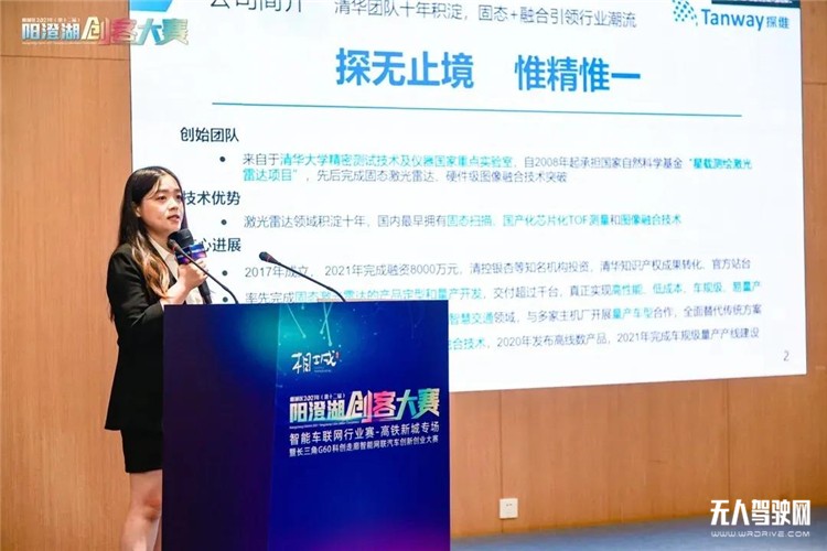 7月11日,由清控科創協辦的2021年(第十二屆)陽澄湖創客大賽智能車聯網行業賽高鐵新城專場暨長三角G60科創走廊智能網聯汽車創新創業大賽成功舉辦,探維科技市場總監王雨晴攜“固態激光雷達+硬件級圖像融合”項目進行現場路演,從來自海內外的10個優秀項目中脫穎而出,榮獲智能車聯網行業賽第一名。