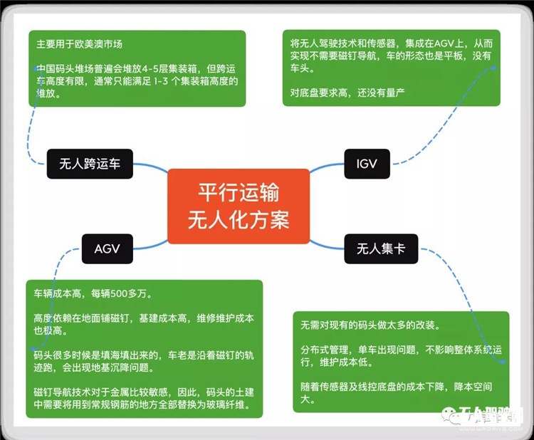 其實,對貨船到堆場之間的往返運輸(行業術語稱為“水平運輸”)而言,無人駕駛集卡并不是唯一方案。已知的方案共有跨運車、AGV、IGV和無人集卡四種: