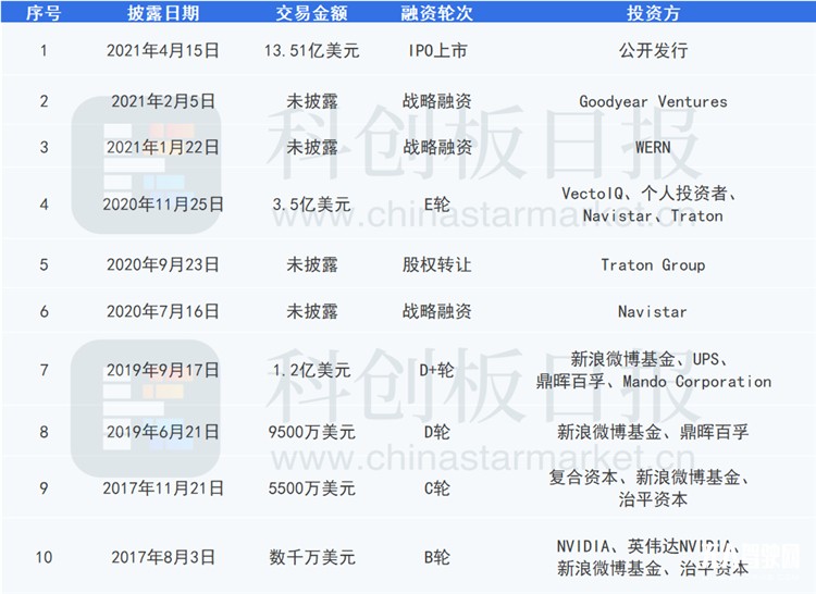 以成立于2015年9月的圖森未來為例,天眼查信息顯示,其成立以來先后獲得10輪融資、融資總額超18億美元,投資方包括英偉達、微創投、治平資本等。