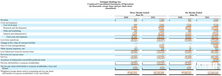此外,圖森未來招股書顯示,2018年至2020年,該公司營收分別為9000美元、71萬美元、184.3萬美元;凈虧損分別為4503萬美元、8488.3萬美元、1.77億美元。