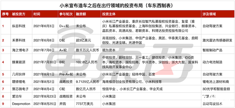 不過跟其他的資本機構不同,小米在投資人的身份之外,也選擇了下場造車,從觀眾變成了參賽選手。所以在宣布造車之后,小米的投資更加集中。