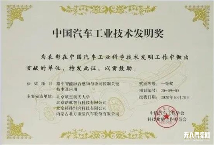 2020年10月,踏歌智行榮獲中國汽車工程學會頒發的中國汽車工業科學技術發明一等獎。