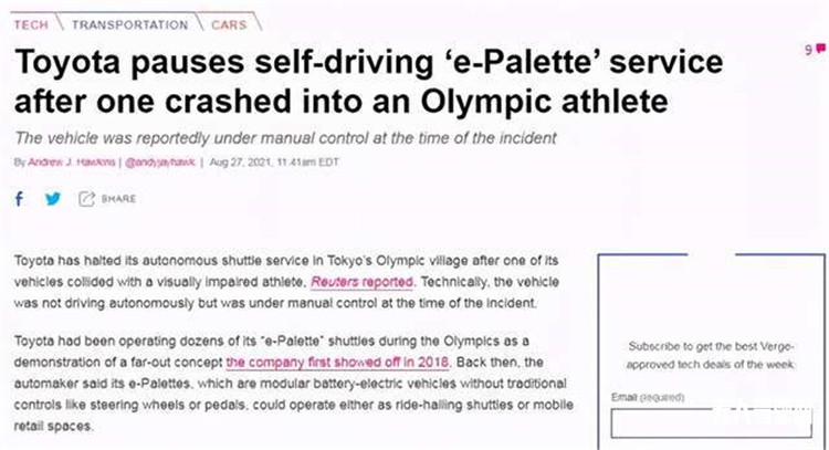 8月26日下午,豐田自動駕駛巴士e-Palette在右轉進入人行橫道時,撞傷了東京殘奧會盲人運動員北園新光。由于傷勢治愈需要兩周時間,再加上心理狀態堪憂,北園新光退出了本屆殘奧會。