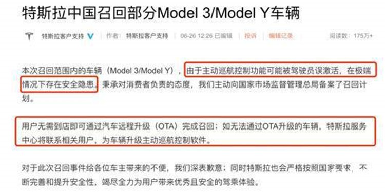 以“特斯拉加速門”為例,2021年6月26日,國家市場監督管理總局發布公告稱,特斯拉將召回部分進口和國產Model3和ModelY電動汽車,總計約28.6萬輛。而特斯拉召回車輛的原因在于其主動巡航控制系統問題,易造成駕駛員誤激活主動巡航功能,以至于在極端情況下存在安全隱患。