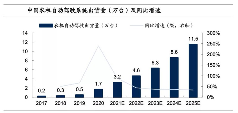 近年來我國農作物綜合機械化率顯著提高,2020年主要糧食作物耕種收綜合機械化率均超過80%,其中農機無人駕駛系統市場有顯著的增長。行業報道,2020 年全國北斗導航農機自動駕駛系統銷量約1.7萬臺,根據農機相關網站公布的2020年銷量前十產品均價5.4 萬元/臺估算,整體市場規模已達9.18 億元;預計2025年出貨量可達11.5 萬套,對應市場規模超60億,20-25年復合增速約47%。