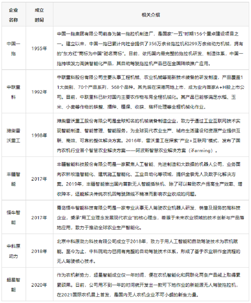 目前農機無人駕駛企業大致分為兩部分,分別是提供產品的本體企業與提供解決方案的科技型企業。