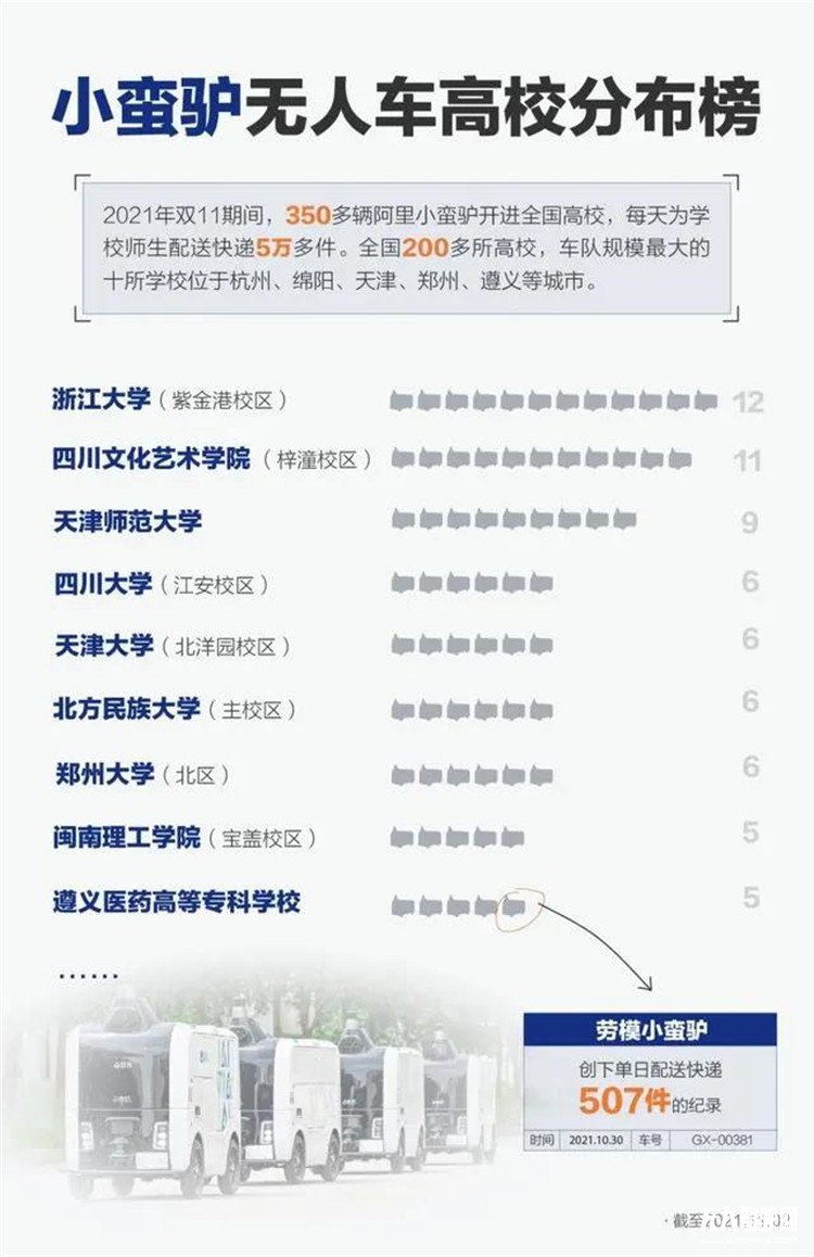 11月2日,菜鳥聯合達摩院宣布,菜鳥無人車小蠻驢已總計完成350輛投放,覆蓋全國70多個城市超過200多所高校。雙11期間,“小蠻驢”為學校師生每天配送快遞5萬多件。阿里達摩院介紹,雙11小蠻驢預計配送快遞超100萬件,“按需預約、定時上門、送貨到樓”,讓高校師生省時省力地收取包裹。小蠻驢還在部分高校試點外賣配送服務,將食堂飯菜送往宿舍樓、行政樓等校內點位。