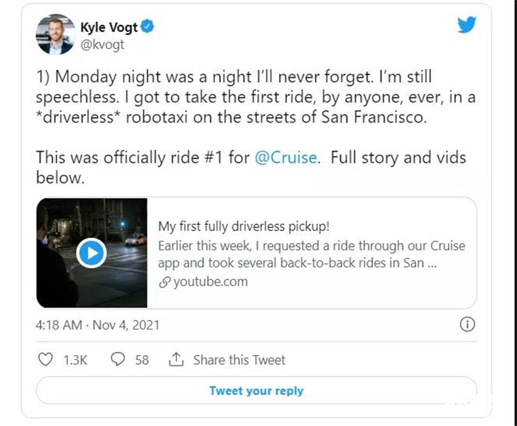 據TechCrunch報道,當地時間本周一晚上,通用汽車旗下自動駕駛子公司Cruise首次在車內沒有人的情況下啟動了一輛AV(自動駕駛汽車)。Cruise公司的聯合創始人、首席技術官兼總裁Kyle Vogt是第一個乘坐的人,他在Twitter上對此進行大肆宣傳。