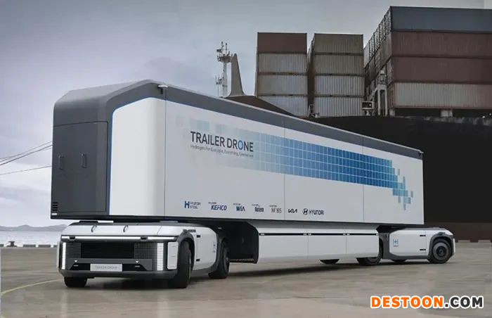 2021進博會上,現代汽車帶來了Trailer Drone概念卡車。作為一種可實現完全自動駕駛的集裝箱運輸系統,其搭載氫燃料電池系統作為動力源,同時搭載兩臺智能無人運輸平臺e-Bogie。