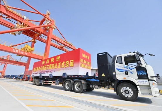 近日,宿遷港中心港區三期碼頭正式投運。斯年智駕無人駕駛集卡“先拔頭籌”,裝載著宿遷港三期碼頭正式投運的第一箱,駛向智慧港口的新起點。