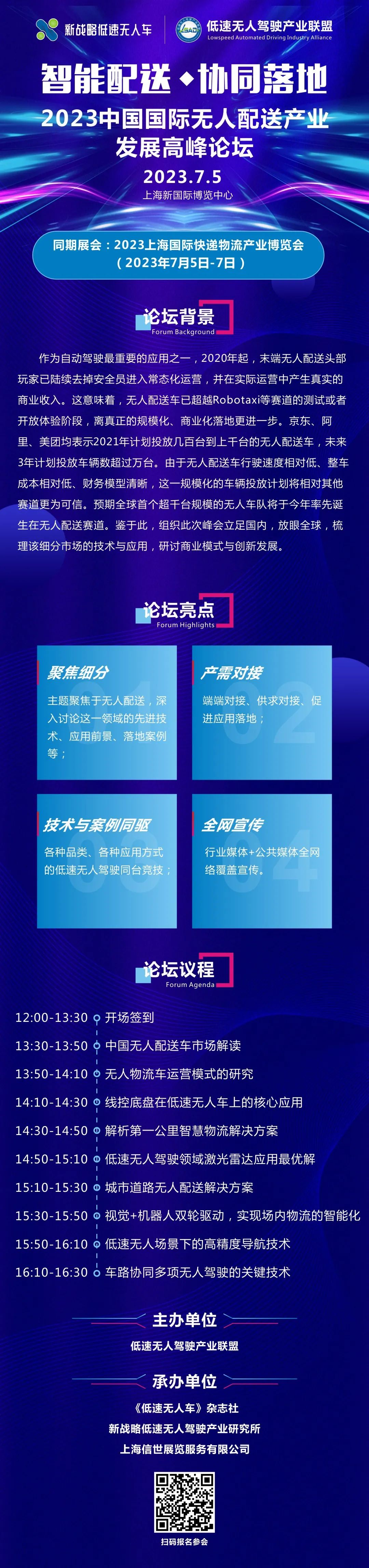 2023年,面對新一輪落地應用之爭,中國無人配送市場現狀如何?需要抓住的未來發展機遇有哪些?為此,低速無人駕駛產業聯盟將舉辦“2023中國國際無人配送產業發展高峰論壇”,立足國內,放眼全球,研討無人配送商業模式與創新發展。