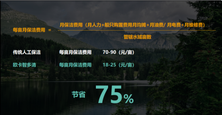 行業中常以每畝水域每月的清潔成本來做比對,每畝水域每月的清潔成本它等于每月花費的保潔費用除以管轄的水域面積。