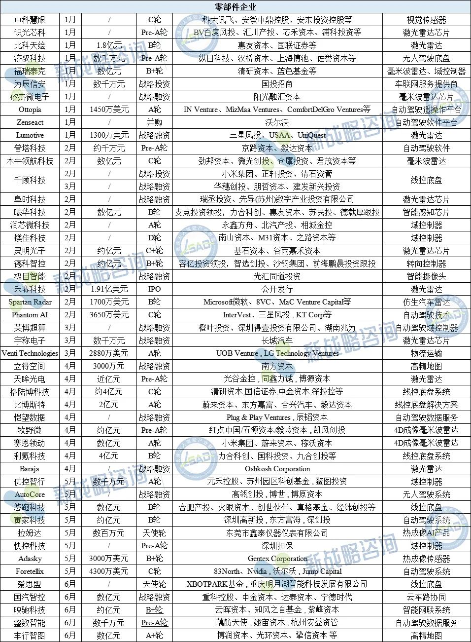 國內外零部件企業共47家獲得融資,激光雷達、線控底盤、毫米波雷達三大核心技術上半年投資熱度靠前。其中,禾賽科技、天眸光電、阜時科技等9家激光雷達企業融資超18億元。