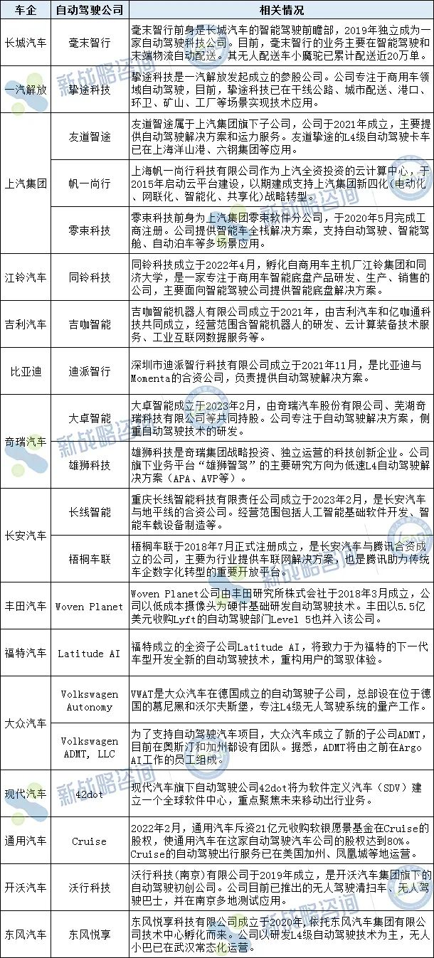 傳統車企自動駕駛子公司布局情況(據公開信息不完全統計,未完善之處請指正)