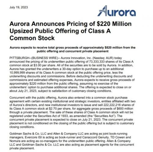 據Aurora上周發布的一份公告顯示,該公司計劃通過私募的方式出售6億美元普通股,并通過公開發行普通股進一步募集2億美元。Aurora的一位發言人表示,該公司已實現了目標,并且因為需求強勁而額外籌集了2000萬美元。