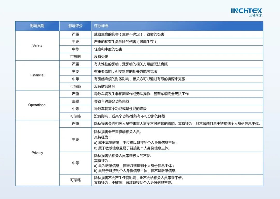 資產識別完成后,我們會得到帶有網絡安全屬性的資產清單,根據不同安全屬性被破壞后對車輛制造商、道路使用者或其他實體所造成的影響確定最終的損害場景。