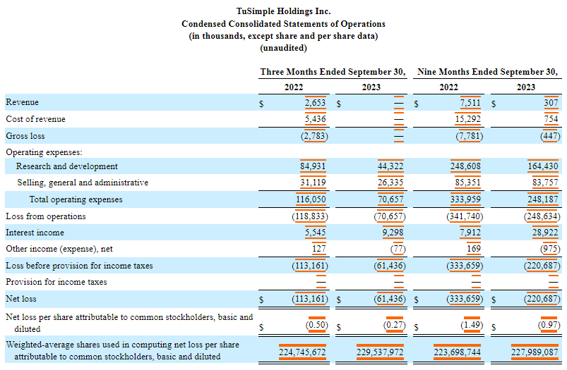 TuSimple 2023 Q3簡明綜合經營報表(以千美元計,股份和每股數據除外)