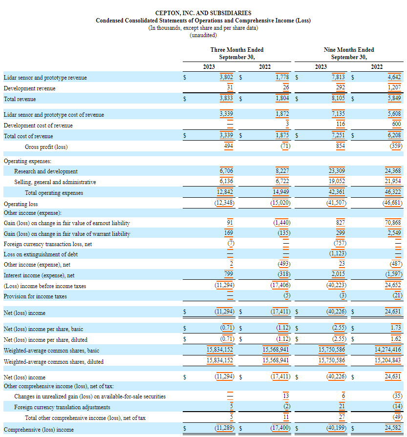 Cepton及其子公司2023Q3合并經營報表(以千美元計,股份和每股數據除外)