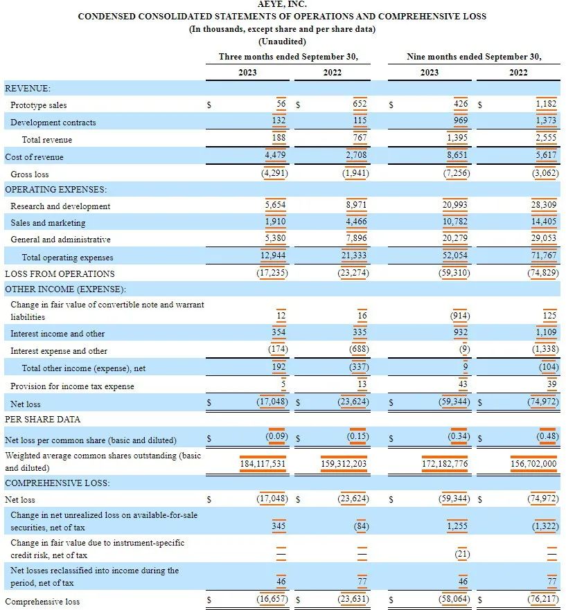 AEye 2023 Q3綜合收益及虧損報表(以千美元計,股份和每股數據除外)