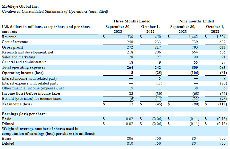 Mobileye 2023 Q3簡明綜合經營報表(以百萬美元計,股份和每股數據除外)