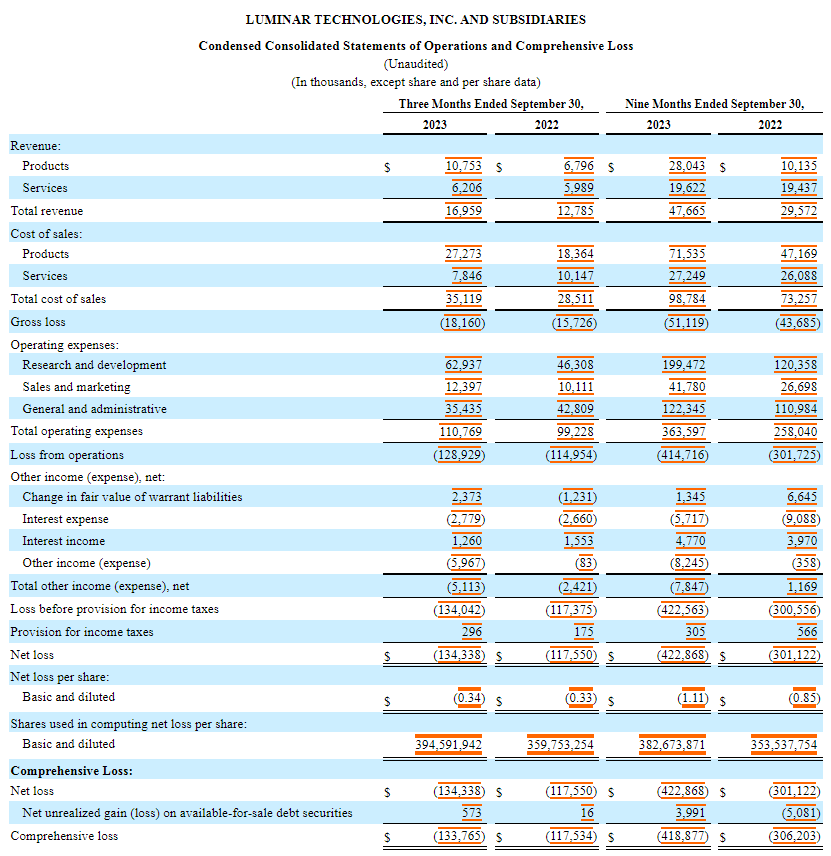 Luminar及其子公司2023 Q3簡明綜合經營報表(以千美元計,股份和每股數據除外)
